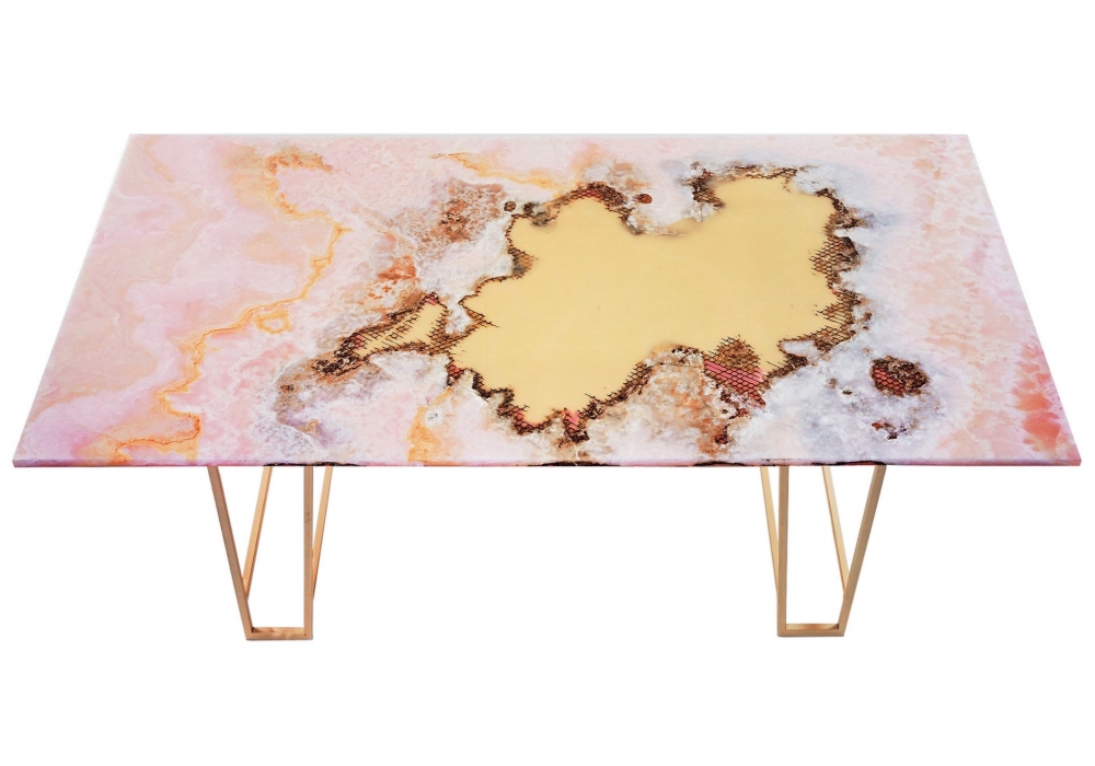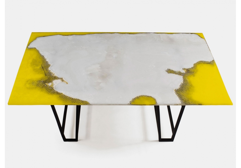 Canyon conçue par Patricia Urquiola pour Budri est une table réalisée en onyx et résine avec jambes en métal. Disponible aussi en 2 finitions: blanc et jaune fluo ou rose et couleur crème.