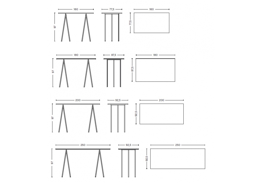 | Dimensions | 160 x 77.5 x H 97 cm; 180 x 87.5 x H 97 cm; 200 x 92.5 x H 97 cm; 250 x 92.5 x H 97 cm. |