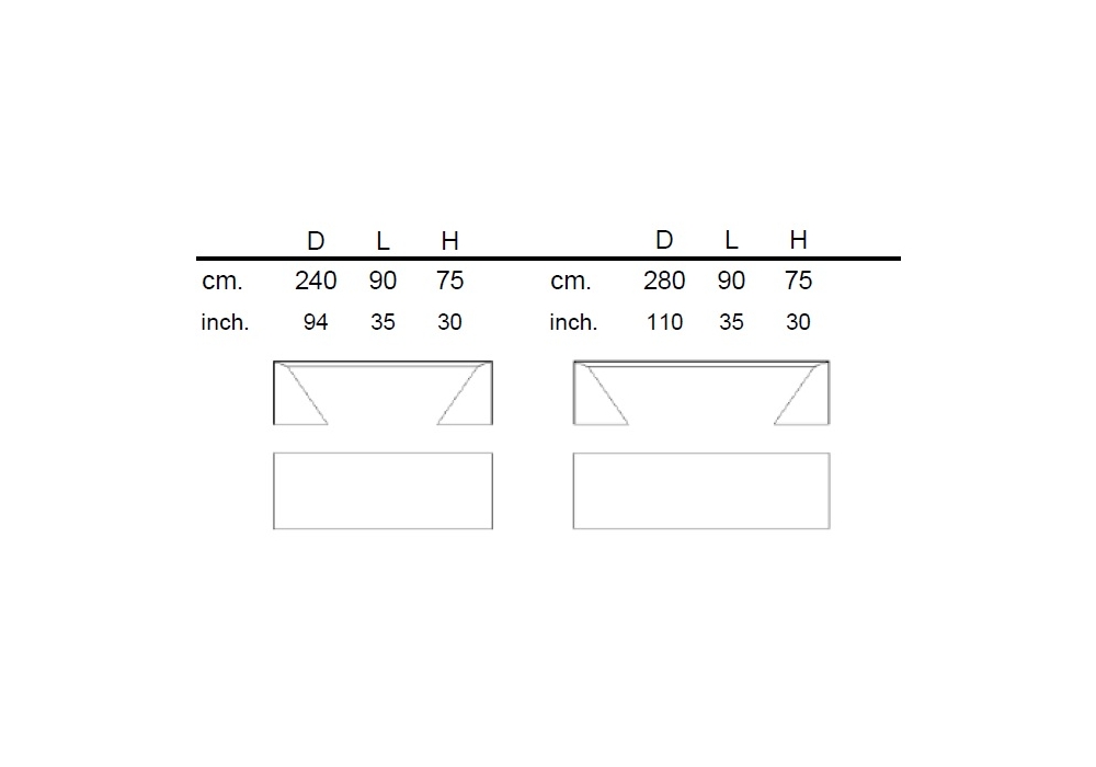 | Dimensions | L 240 x W 90 x H 75 cm; L 280 x W 90 x H 75 cm |