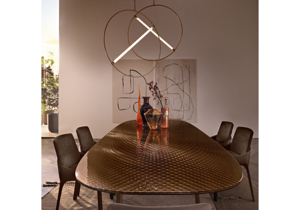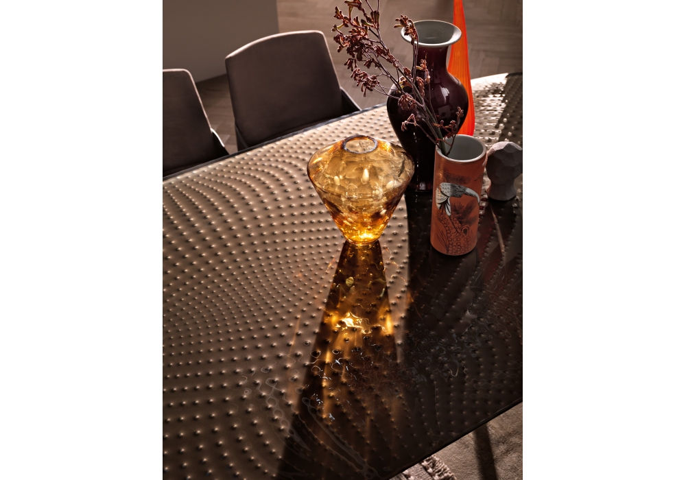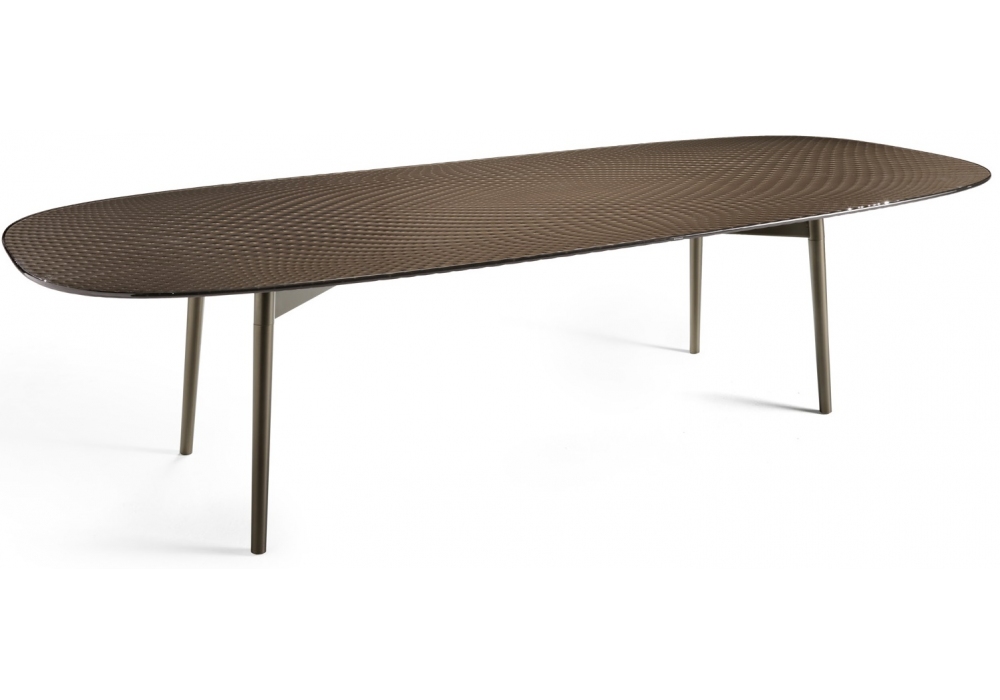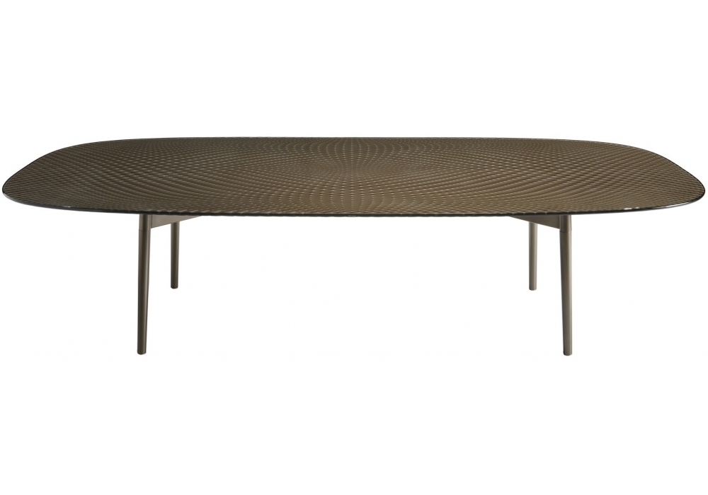 Coral Beach conçue par Mac Stopa pour Fiam est une table avec plateau en verre fusionné et trempé, disponible transparent ou rétrolaqué avec des peintures métallisées. Base en métal peint Gris Lave ou Grège métallisé.