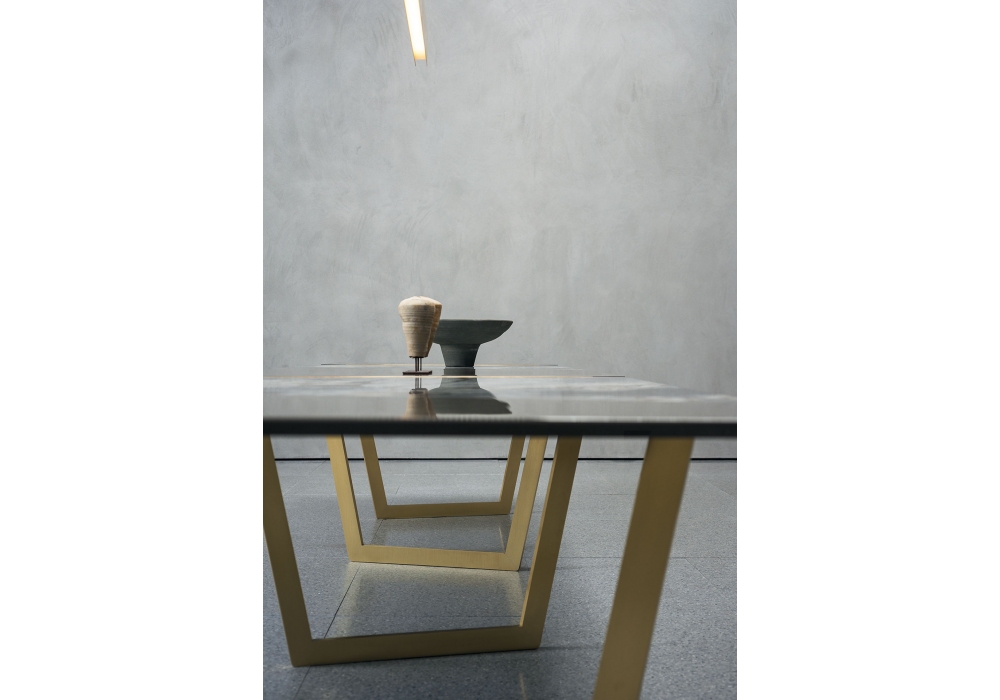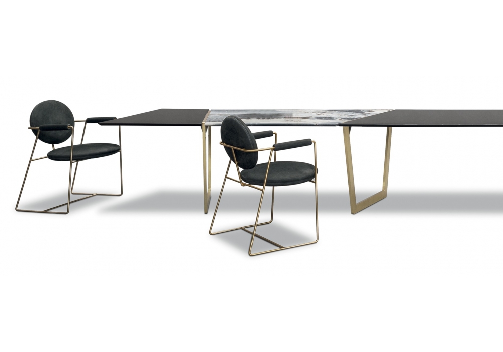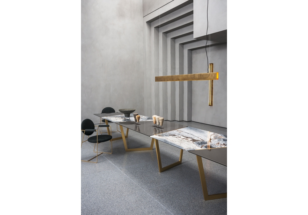Pangea conçue par Hagit Pincovici pour Baxter est une table avec plateau en MDF laqué et éléments décoratifs en marbre. Base en laiton satiné. Disponible en trois différentes dimensions.