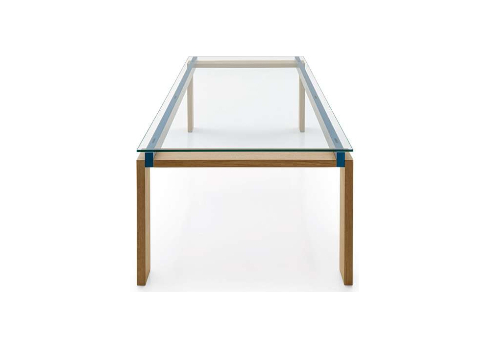 Parallel Structure conçu par Michael Anastassiades pour B&B Italia est une table réalisée en bois massif avec des traverses de support en métal peint disponible en trois finitions et le plateau disponible en différentes finitions en bois ou en verre. Disponible également en deux tailles.