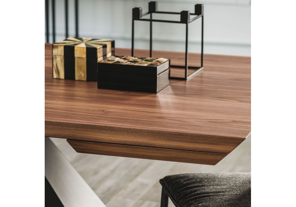 Eliot Wood Drive conçue par Giorgio Cattelan pour Cattelan Italia est une table extensible avec base en acier et plateau en noyer canaletto ou en chêne brûlé. Disponible en 5 tailles.