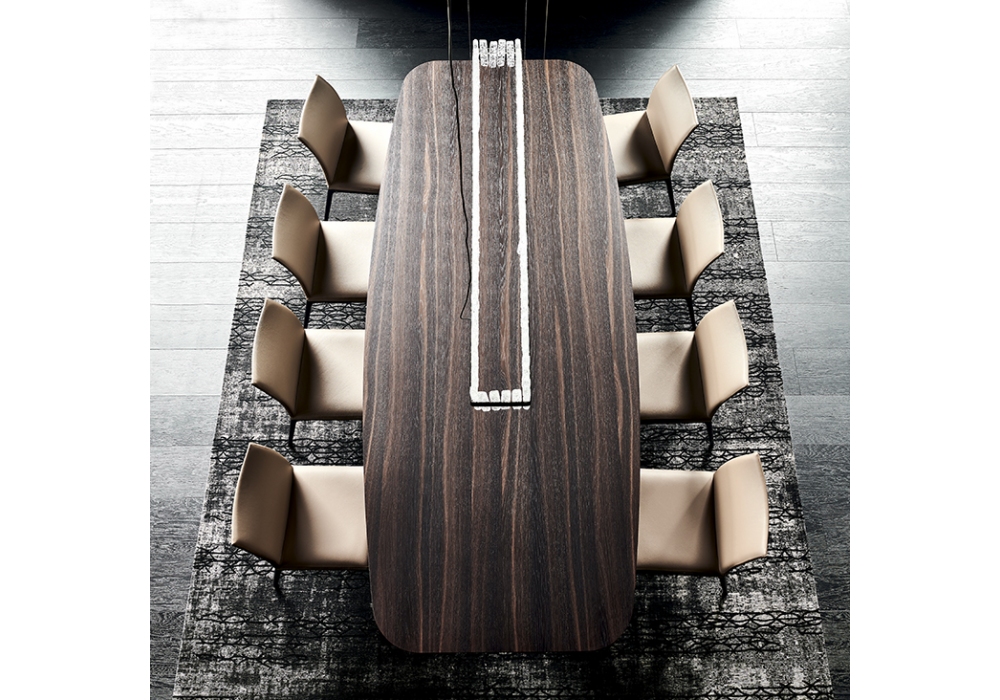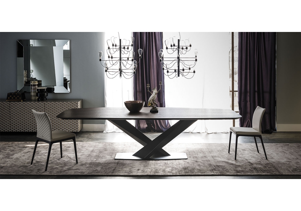 Stratos Wood conçue par Studio Kronos pour Cattelan Italia est une table avec base en acier gaufré. Version S avec bords irreguliers en bois massif noyer Canaletto, rouvre brulé ou rouvre naturel en épaisseur 4 cm. Version "A": plateau en noyer Canaletto, , rouvre brulé ou rouvre naturel avec bords biseautés. Plateau 200x100 avec épaisseur 4 cm, plateaux 240x120 et 300x120 avec épaisseur 5 cm. Version "B": plateau avec bords biseauté en noyer Canaletto ou rouvre brulé. Version “Masterwood” plateau en forme de bateau en noyer Canaletto ou rouvre brulé réalisé avec des planches de bois de différentes dimensions placées en diagonale. Bords obliques et arrondis.