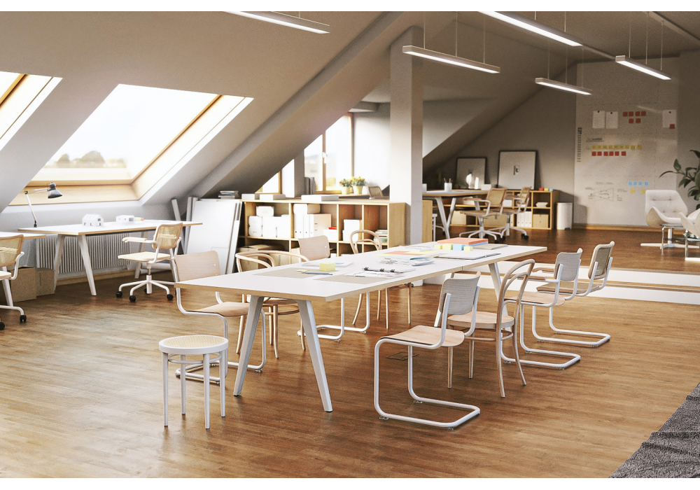 1500 conçue par Wolfgang C.R.Mezger pour Thonet est une table avec pieds en aluminium enduit de poudre et plateau disponible en différentes finitions. Aussi disponible en 3 dimensions.