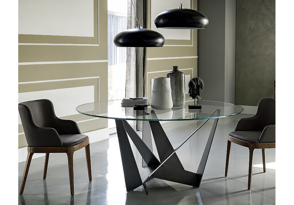 Skorpio Round conçue par Andrea Lucatello pour Cattelan Italia est une table avec base en acier et plateau en verre transparent ou en bois. Disponible en 4 tailles et en différentes finitions.