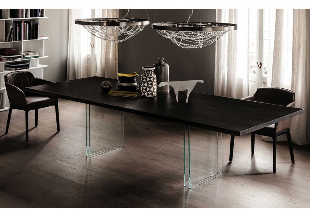 Ikon conçue par Philip Jackson pour Cattelan Italia est une table avec base en verre trempé transparent, poutre en métal ou en bois et plateau en bois à bords irréguliers en bois massif. Disponible en trois tailles.