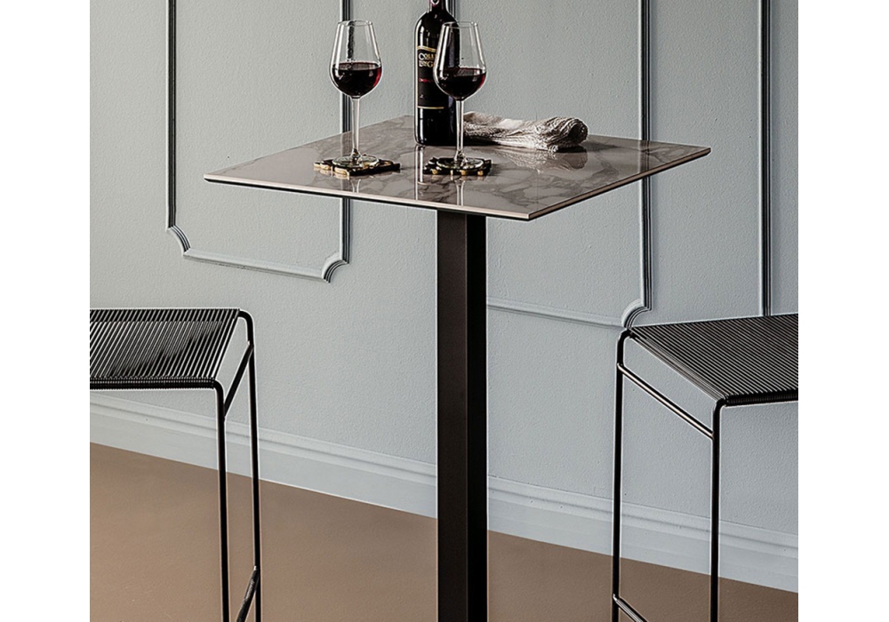 Xom Keramik conçue par Paolo Cattelan pour Cattelan Italia est une table carrée avec base en acier et plateau en marbre. Disponible en différentes finitions et deux tailles.