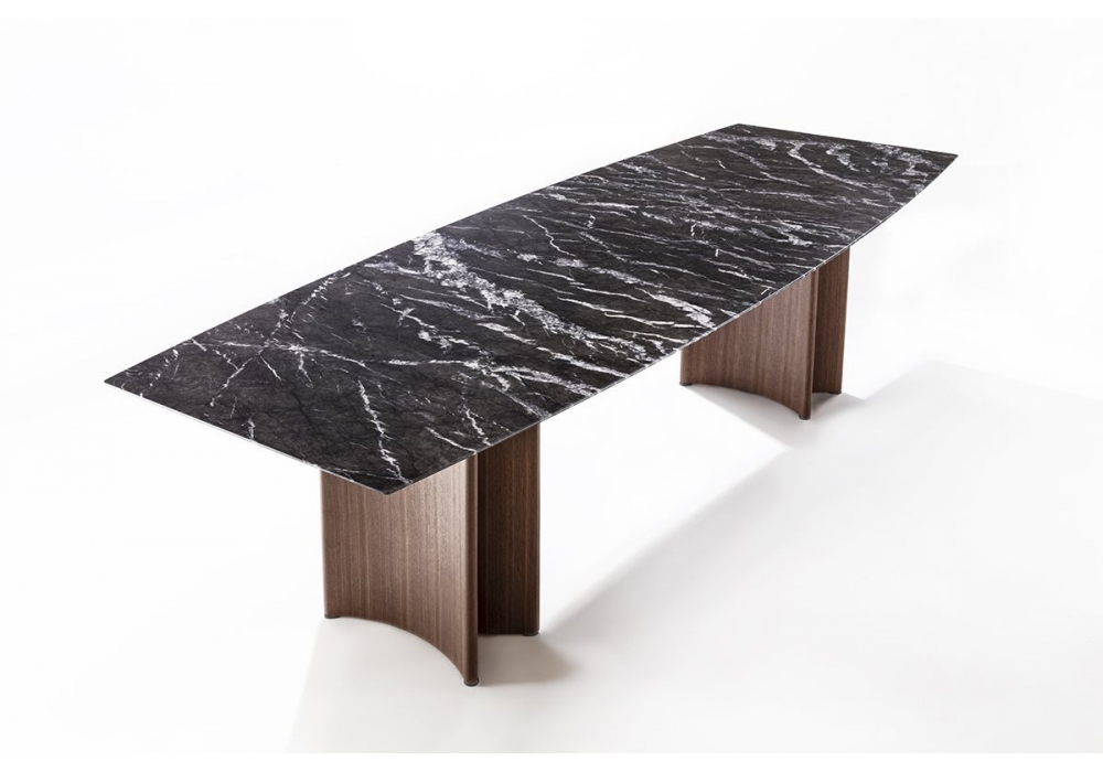 Alan jambes M conçu par Gabriele et Oscar Buratti pour Porada est une table avec base composée d'éléments en croissant simples ou combinés en noyer canaletta et plateau en marbre. Pointes métalliques en finition chrome noir. Disponible en différentes tailles dans les versions rondes et rectangulaires.