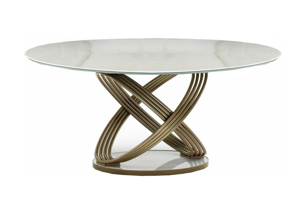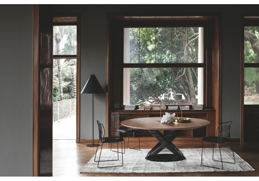 Fusion Round conçue par Pocci & Dondoli pour Bontempi est une table avec plateau en cristal, bois ou supermarché. Différentes finitions sont disponibles.