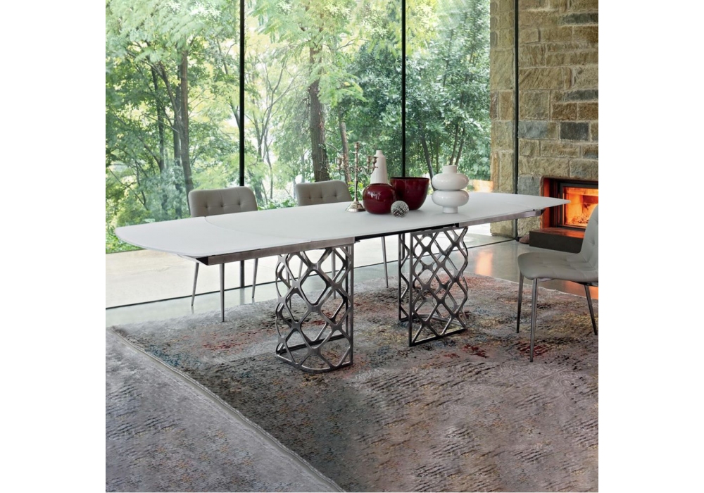 Majesty Extensible conçue par Marco Corti pour Bontempi est une table extensible avec structure en acier laqué et plateau en cristal. Différentes finitions et tailles sont disponibles.