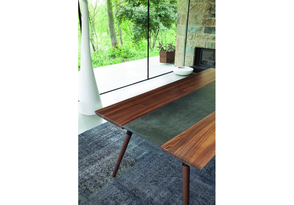 Salt&Pepper conçue par Guggenbichler pour Tonon est une table avec des pieds en chêne massif ou en noyer canaletto avec des détails en acier inoxydable poli, mat ou laqué noir. Plateau formé de deux panneaux latéraux en chêne massif ou noyer canaletto, plaque centrale en céramique oxyde noir de 10 mm.