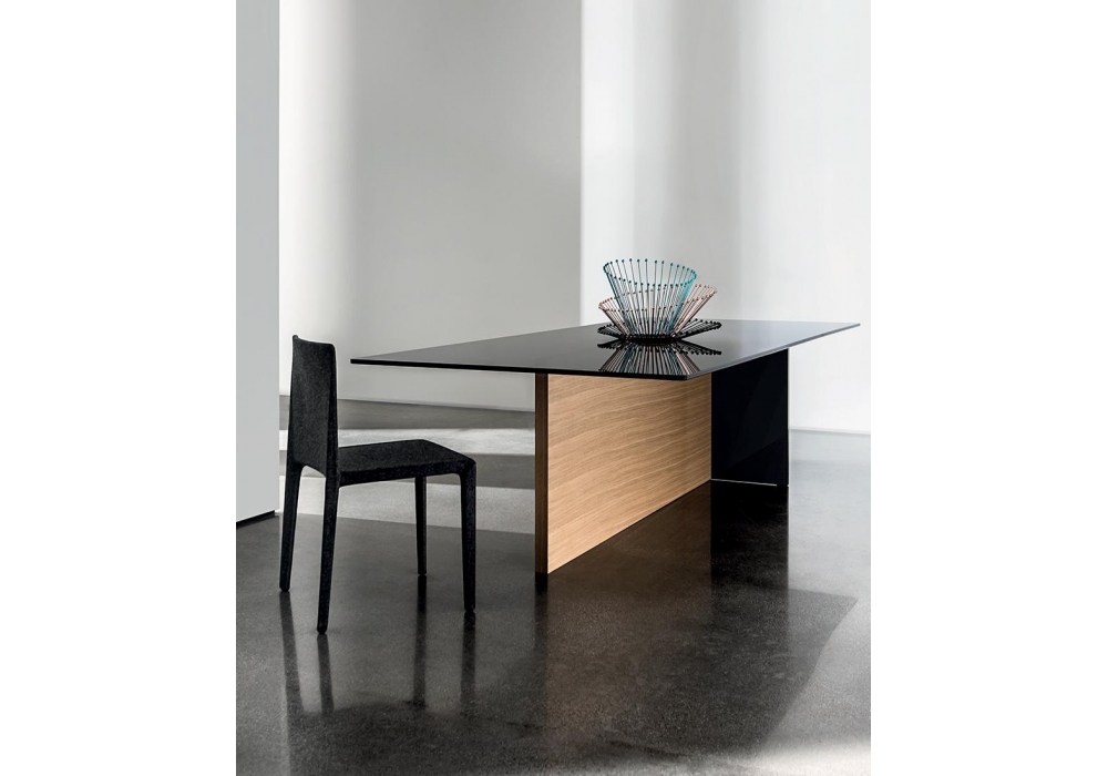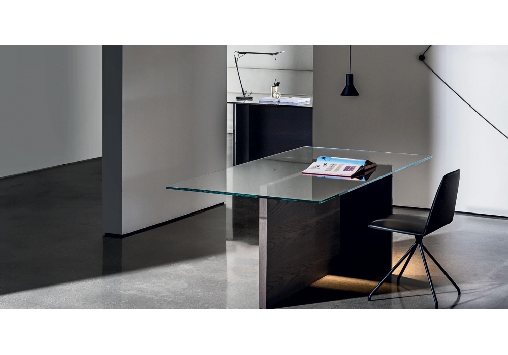 Regolo conçue par Lievore, Altherr, Molina pour Sovet est une table réalisée avec un top en verre, une base composée d'un élément en bois et d'un élément en verre feuilleté laqué noir. Disponible en différentes dimensions. Top et élément en bois dans différentes finitions.