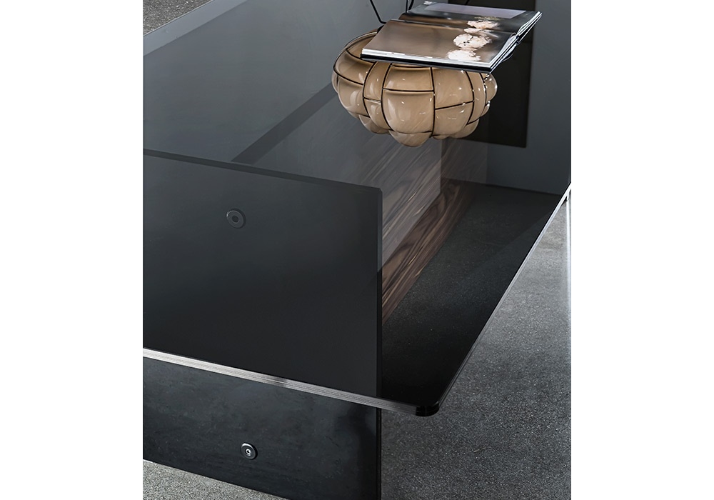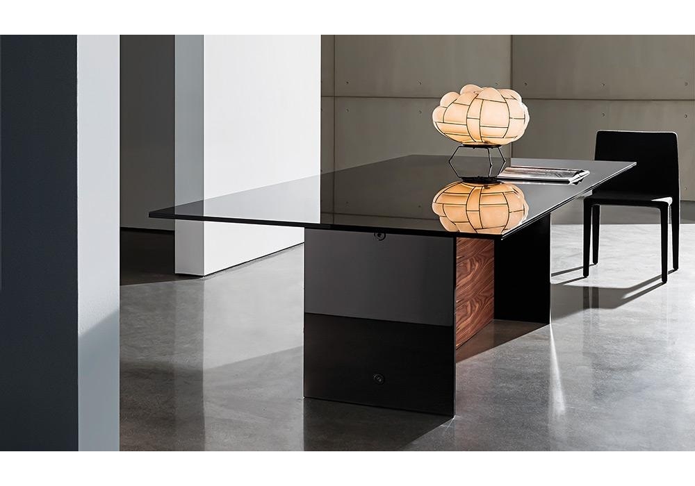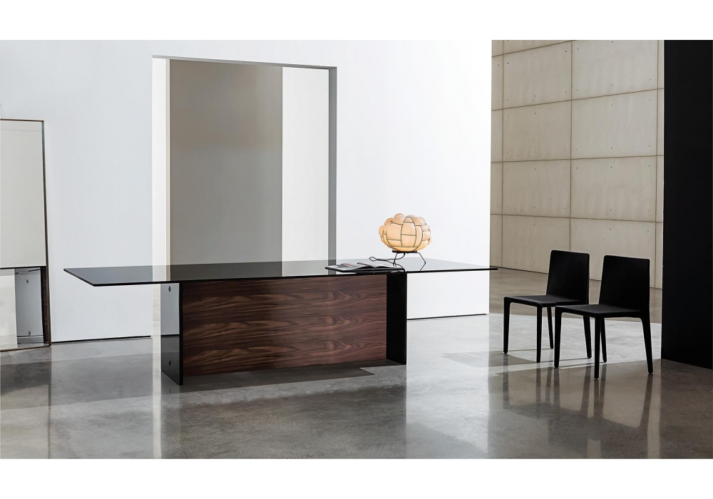 Regolo Double Base conçue par Lievore, Altherr, Molina pour Sovet est une table réalisée avec un top en verre, une base composée d'un élément en bois et de deux éléments en verre feuilleté laqué noir. Top et élément en bois dans différentes finitions.