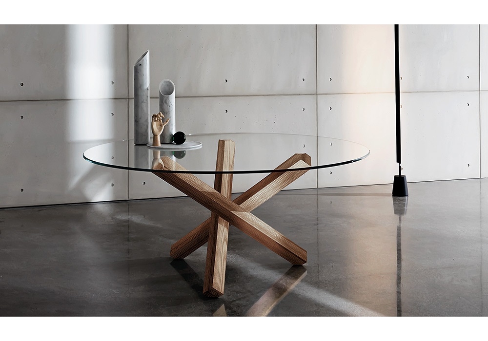 Aikido conçue par Studio Sovet pour Sovet est une table ronde réalisée avec une base en métal ou en bois et un plateau en verre, céramique ou bois. Disponible en différentes finitions et dimensions.