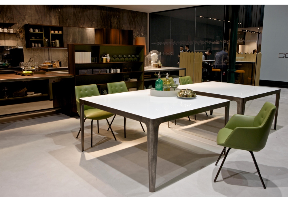 Grand More conçue par Estel R&D est une table avec des pieds en métal, des profilés en aluminium et un plateau en stratifié, bois, céramique ou essence de verre. Disponible en différentes finitions et également en version extensible.