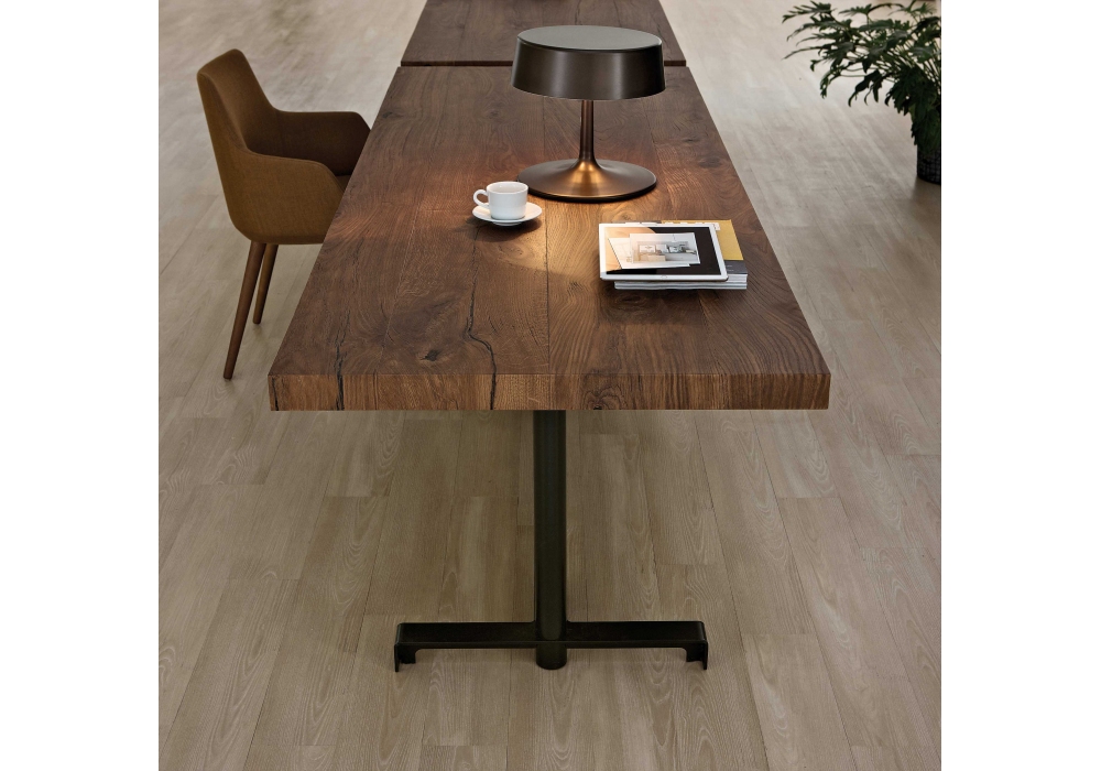 Sanmarino conçue par Estel R&D pour Estel est une table avec structure en métal peint et plateau en planches en différentes essences. Articles de décoration non inclus dans le prix.