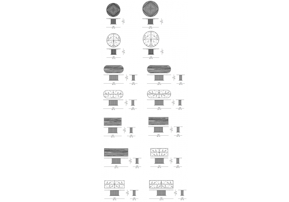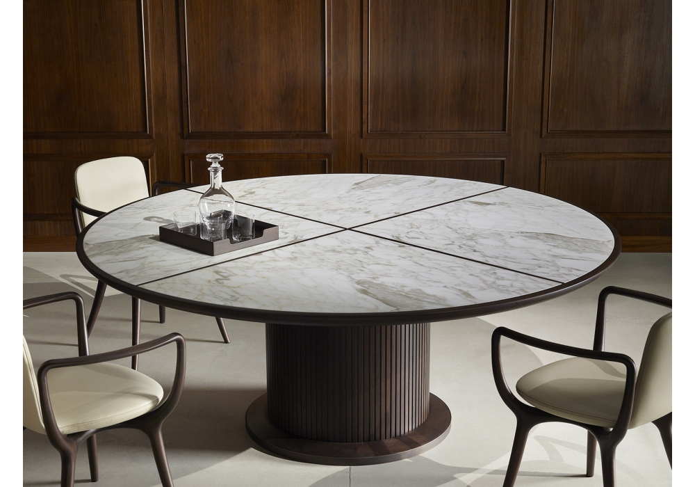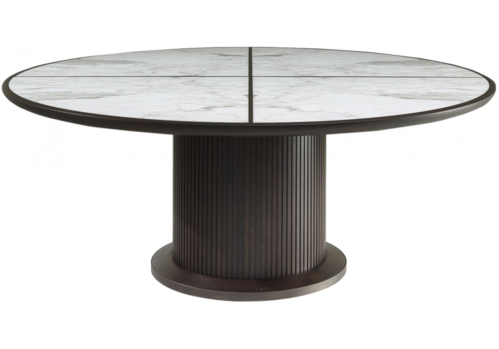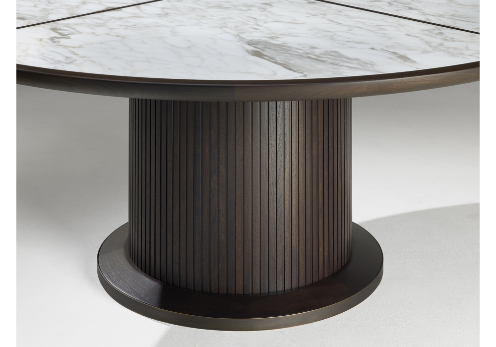 Full conçue par Roberto Lazzeroni pour Ceccotti Collezioni est une table en noyer américain massif et contreplaqué de peuplier. Structure recouverte de lamelles en bois massif de noyer américain. Piètement en laiton bruni. Plateau en marbre ou bois. Le plateau en marbre est divisé en 4 sections, incrustation croisée en noyer américain. Disponible en différentes dimensions.