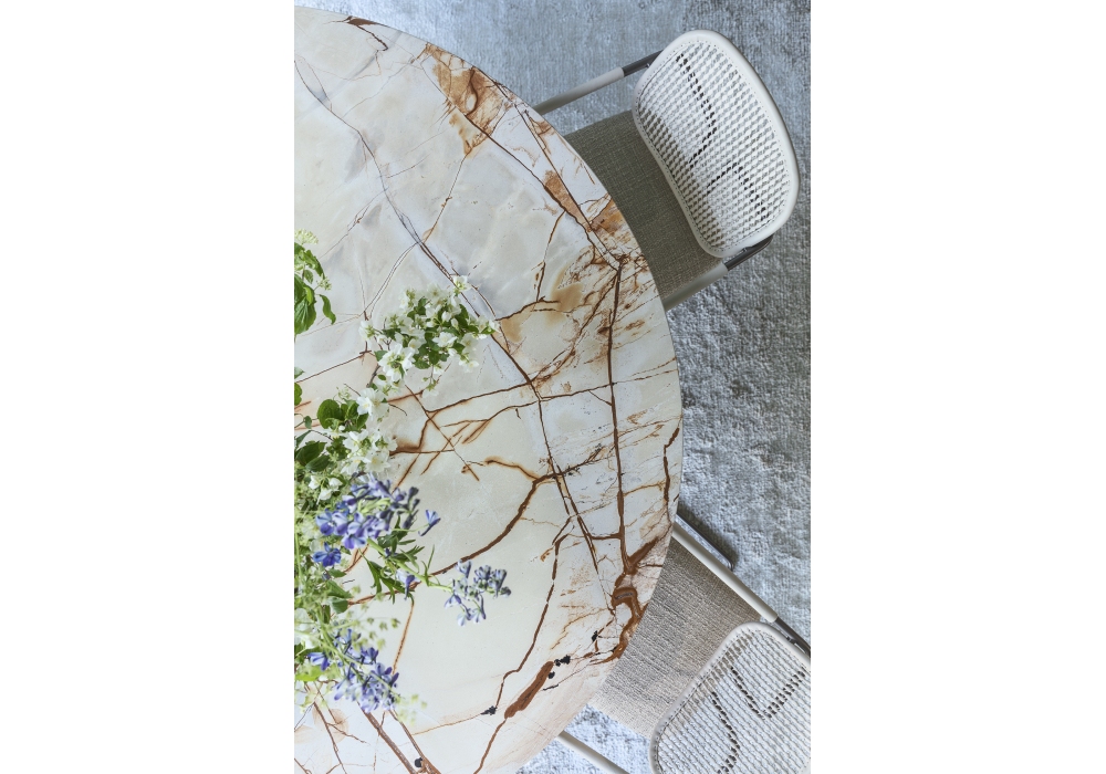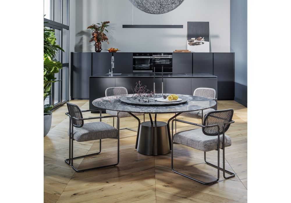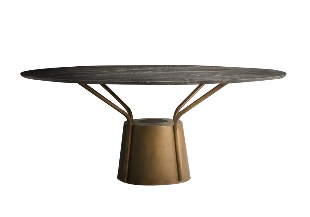 Balloon conçue par Volodymyr Karalyus pour Natevo est une table ronde avec structure et base en bronze anodisé. Plateau en marbre disponible en différentes finitions. Offert en deux tailles. Il est possible de combiner le plateau Lazy Susy.