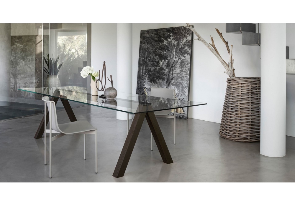 Sesto conçue par Piero Lissoni pour Lema est une table réalisée avec poutre en métal gris foncé, structure en chêne massif traité thermiquement ou frêne naturel et plateau en verre transparent extra-clair. Disponible en différentes dimensions.