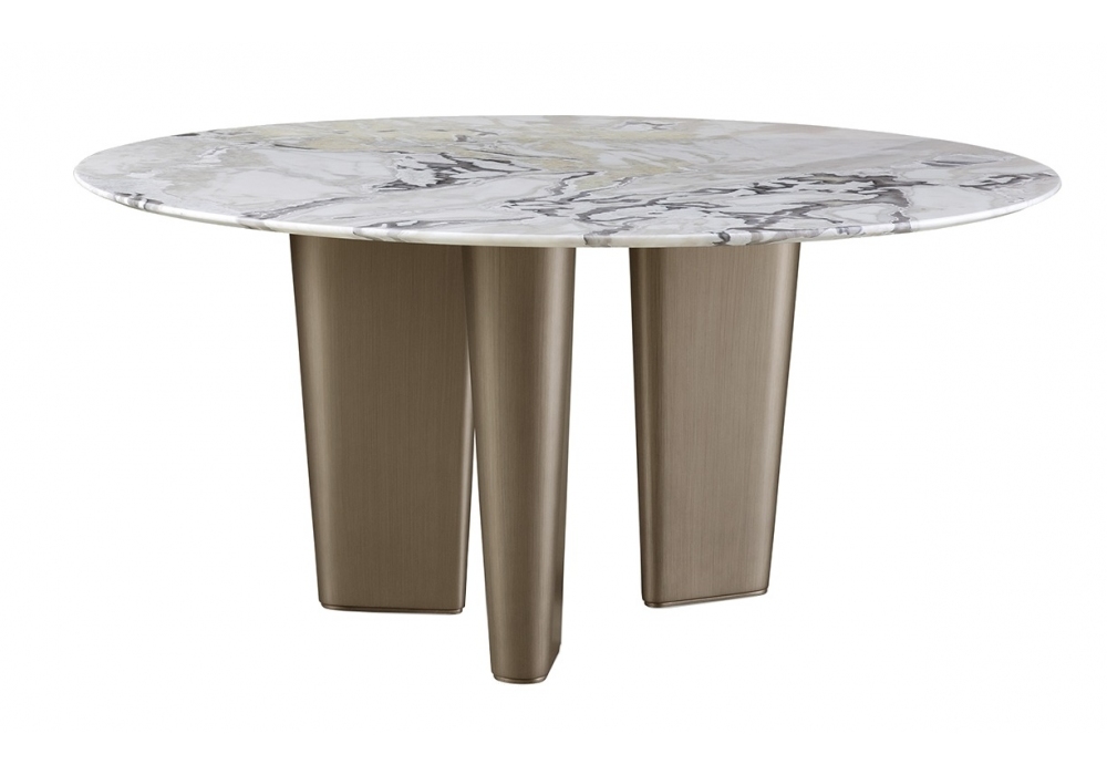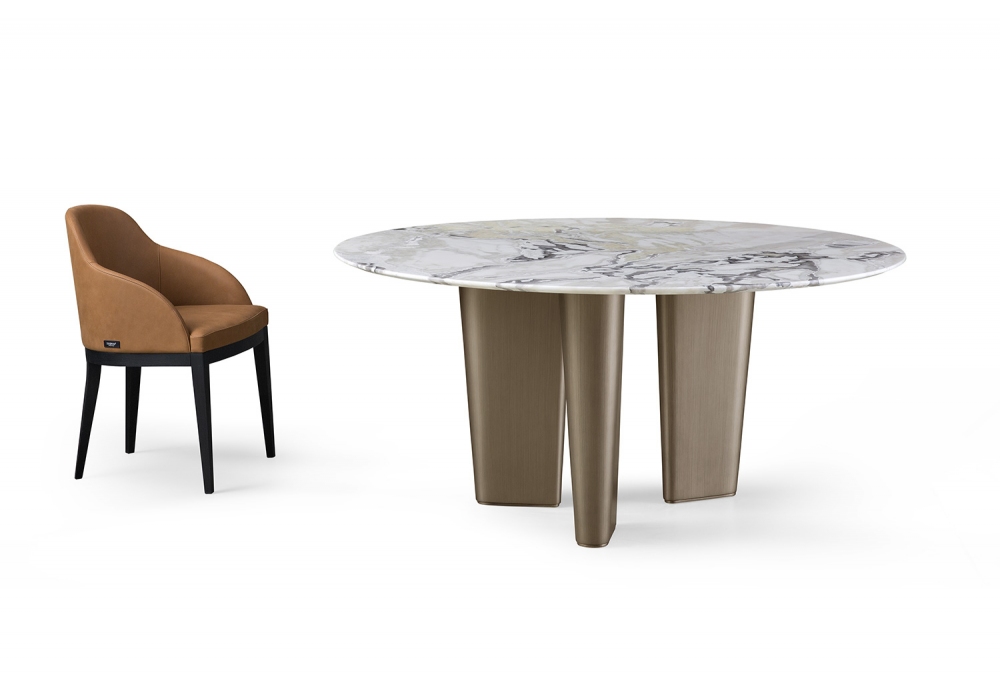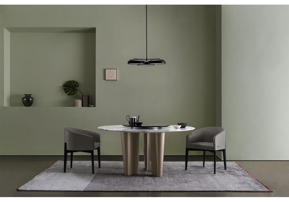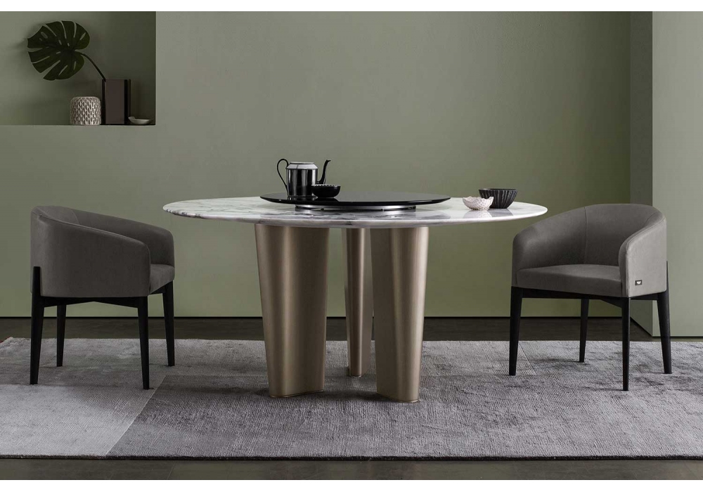 Otto conçue par Carlotta Manzoni pour Bodema est une table à manger avec un cadre en MDF peint en couleur laiton satiné et un plateau en marbre disponible en différentes finitions. Elle est disponible en plusieurs tailles et avec l'option Lazy Susan.