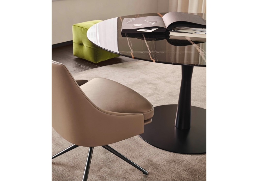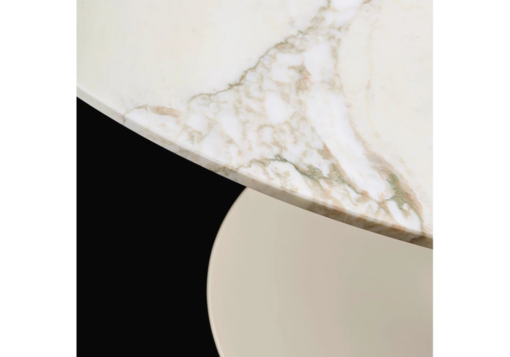 Flute conçue par Roberto Barbieri pour Poliform est une table ronde avec plateau en marbre et base en tréfilé aluminium, laqué mat/brillant, anti-rayures ou verni.