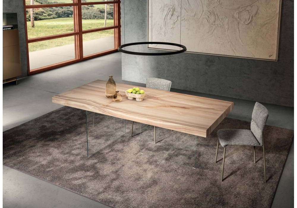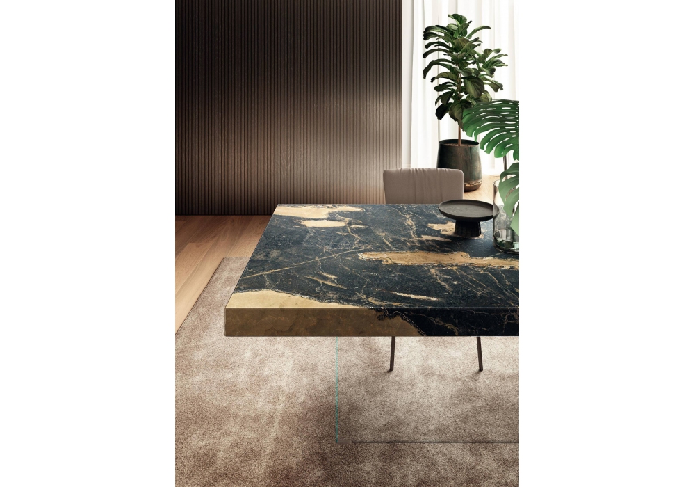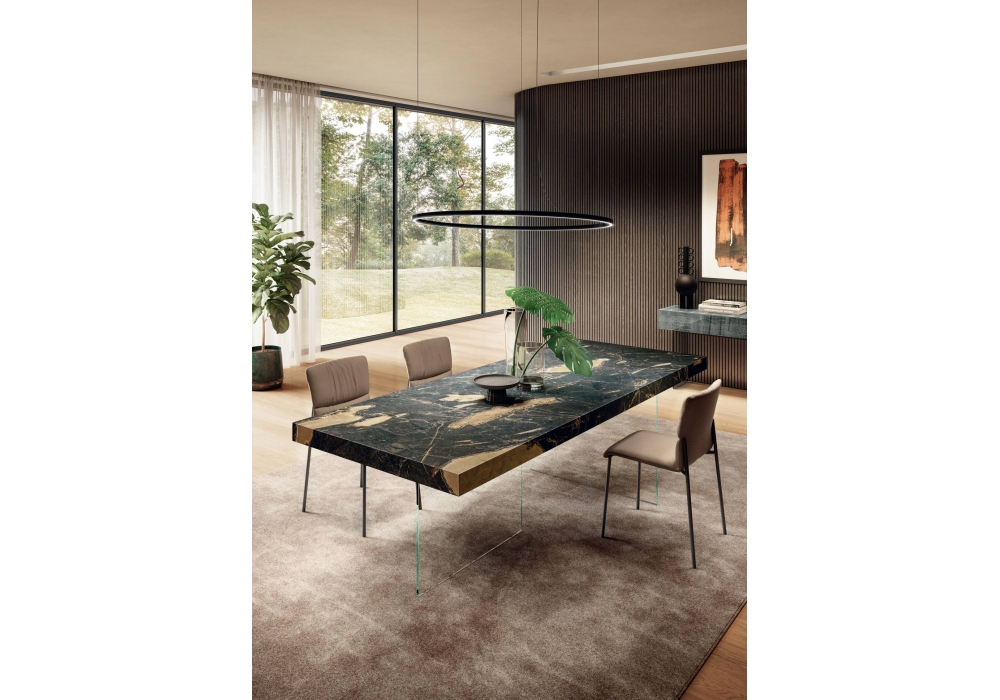 Air XGlass conçue par Daniele Lago pour Lago est une table réalisée avec un plateau en XGlass brillant ou mat et des pieds en verre extra-clair ou gris fumé. Disponible en différentes finitions et dimensions.