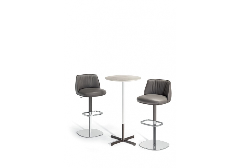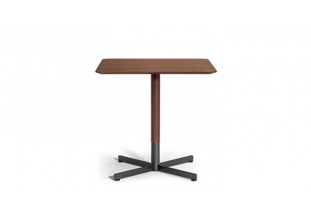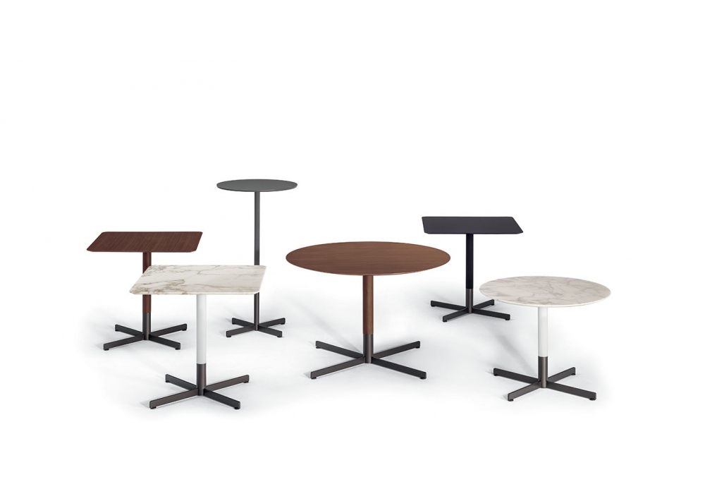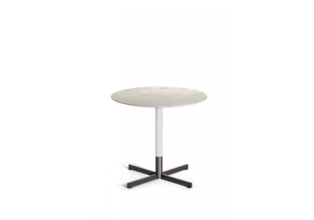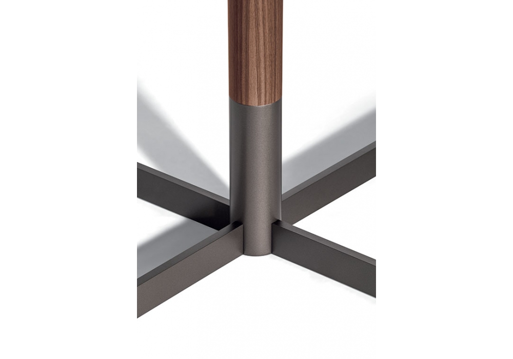 Bob Bistrot conçu par Jean-Marie Massaud pour Poltrona Frau est une table avec base en acier bruni avec pieds réglables en métal assorti; partie supérieure du pied en acier avec col fini en Noyer Canaletto lorsque le plateau est en Noyer Canaletto, ou peint lorsque le plateau est en marbre ou Fenix NTM®. Plateau disponible en noyer Canaletto, marbre doré Calacatta ou Fenix NTM®. Il est disponible en forme ronde ou carrée et en différentes tailles.