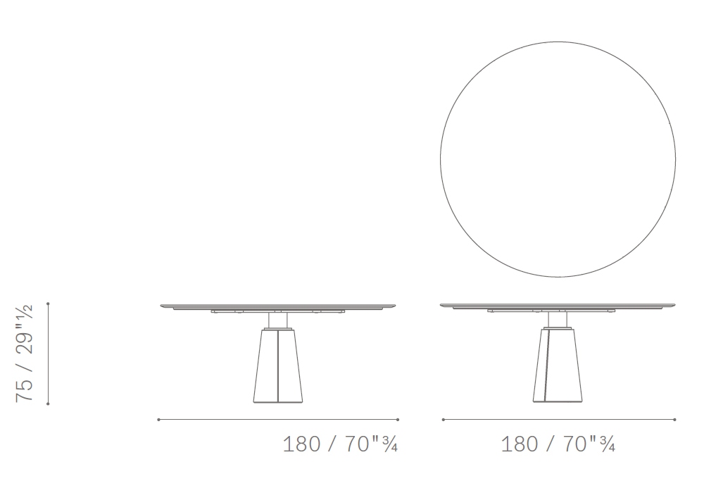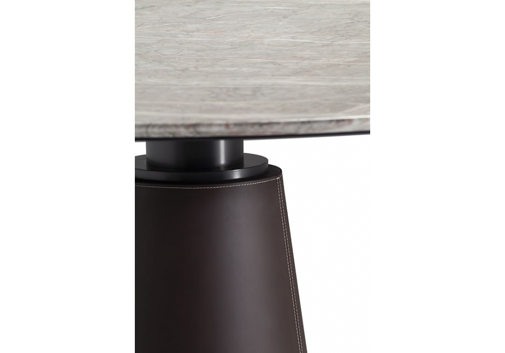 Mesa Due conçue par Lella et Massimo Vignelli pour Poltrona Frau est une table avec base en acier recouverte de Pelle Frau SC ou cuir de selle et plateau en marbre. Il est disponible en différentes tailles de table ronde et en forme rectangulaire. La version Ø180 cm est également disponible avec Lazy Susan.