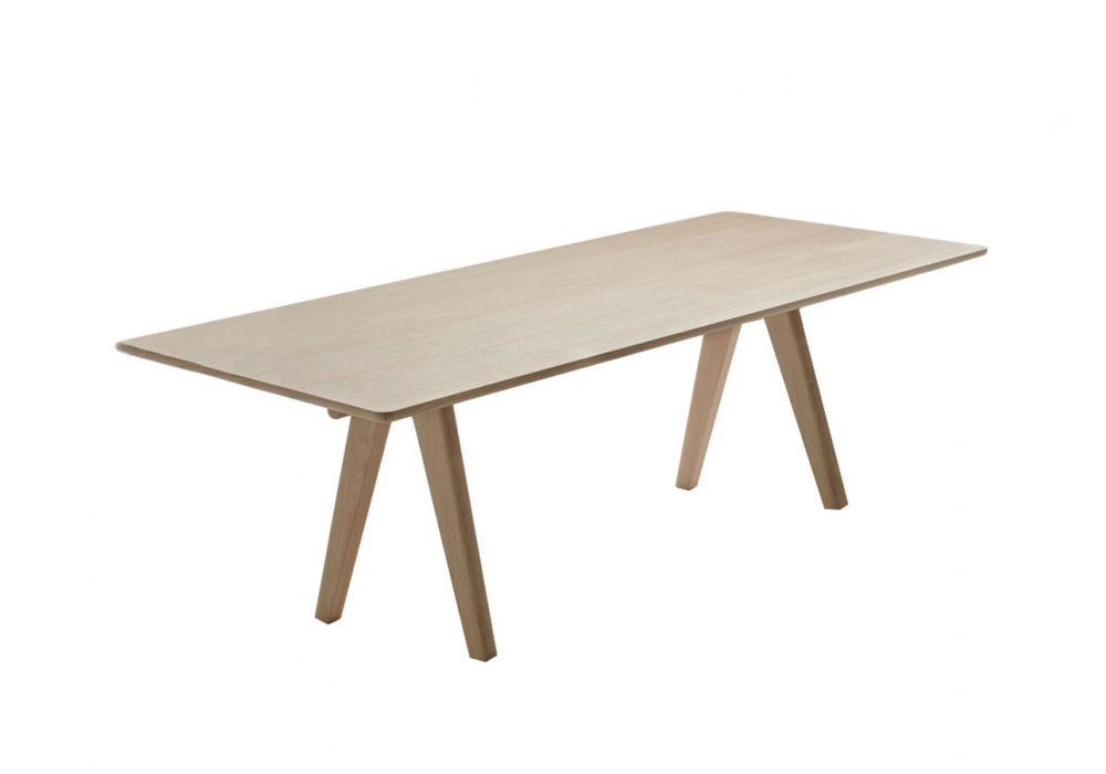 Mathilda conçue par Patricia Urquiola pour Moroso est une table avec plateau en MDF plaqué en différentes finitions et base en chêne massif. Semelles intérieures en polypropylène avec patins feutre/polyamide interchangeables. Il est disponible rond ou rectangulaire.