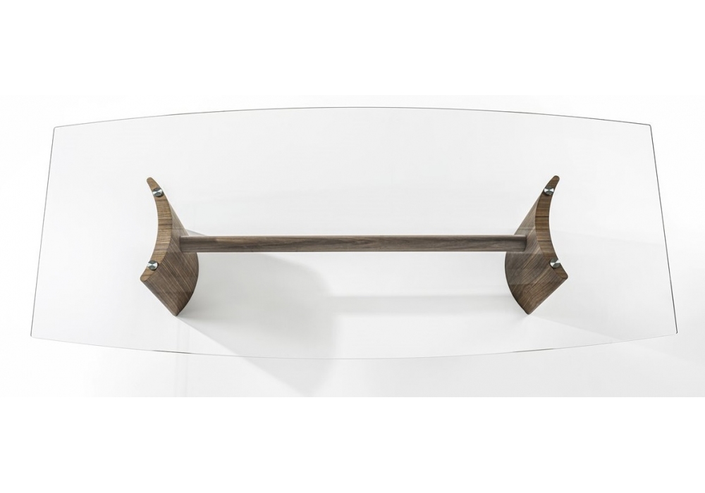 Beam conçue par Gabriele & Oscar Buratti pour Porada est une table réalisée avec deux bases en demi-lune en noyer canaletta réunies par une poutre centrale en bois. Plateau en verre transparent. Embouts en métal. Disponible en différentes finitions.