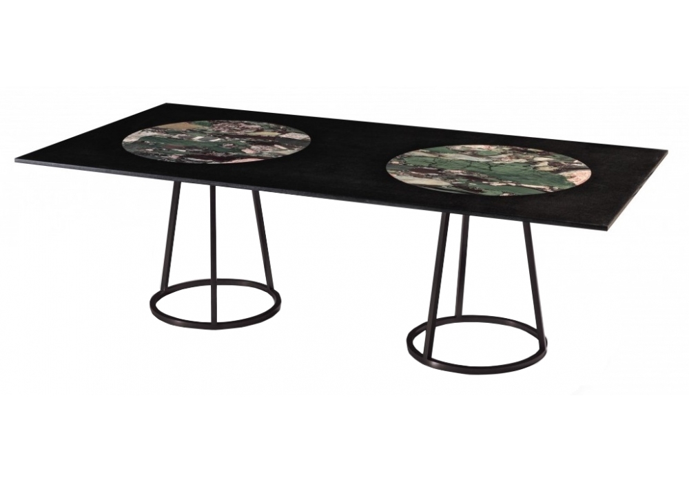 Pantheon Rectangular conçue par Maarten De Ceulaer pour Budri est une table réalisée avec un fond en marbre Noir de Belgique et des cercles en marbre Opera d'Arte. Base en métal brossé, noir mat.