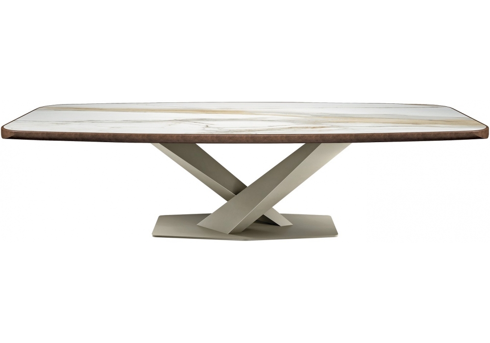 Stratos Keramik Premium conçu par Paolo Cattelan pour Cattelan Italia est une table composée d'une base en acier laqué gaufré et plateau en céramique Marmi en couleurs différentes avec profil inférieur arrondi laqué Brushed Bronze ou Brushed Grey. Le plateau 300x128 a une épaisseur de 6cm, les plateaux 200x120 et 240x120 de 5cm.