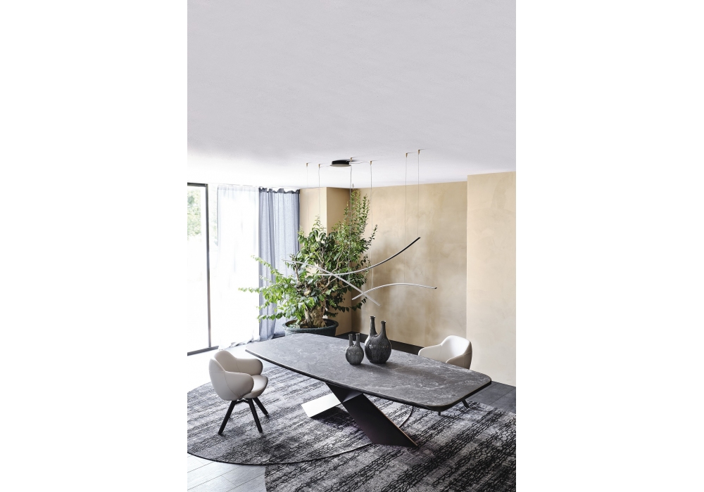 Tyron Keramik Premium conçu par Paolo Cattelan pour Cattelan Italia est une table composée d'une base en acier laqué gaufré et plateau en céramique Marmi en couleurs différentes avec profil inférieur arrondi laqué Brushed Bronze ou Brushed Grey. Le plateau 300x128 a une épaisseur de 6cm, les plateaux 200x120 et 240x120 de 5cm.