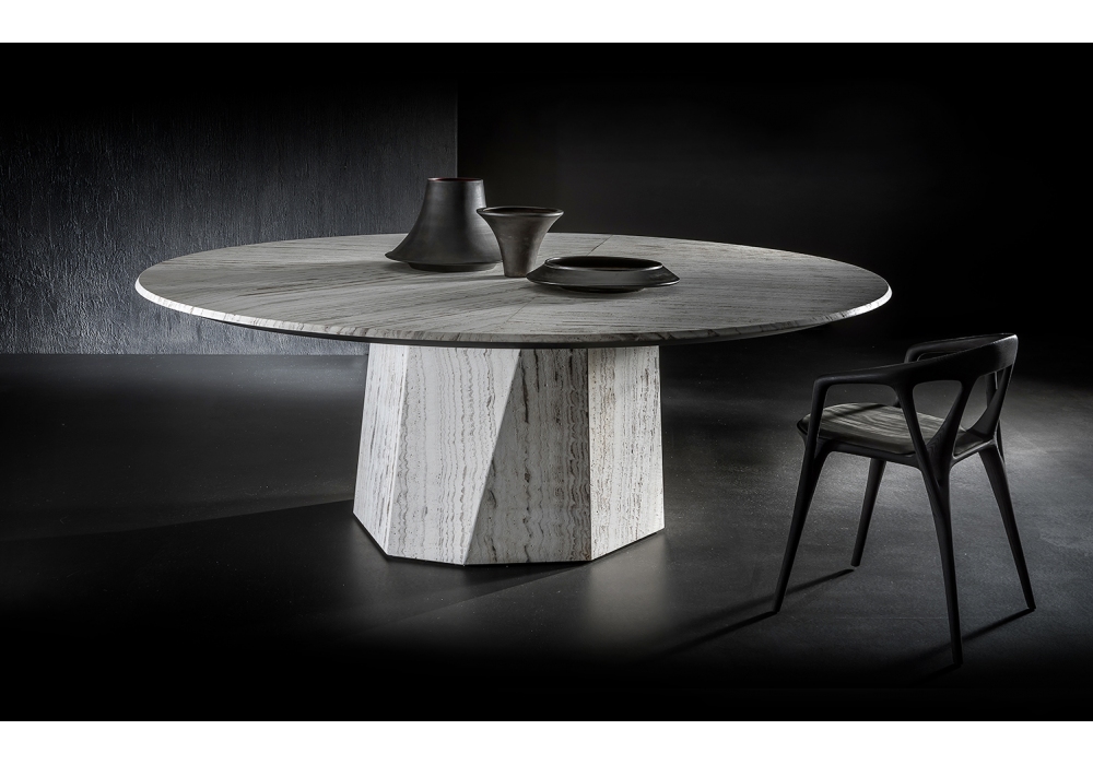 Zenith conçue par Massimo Castagna pour Henge est une table composée d'une structure interne en acier recouverte de pierre et d'un plateau en pierre en 3 parties sur un plateau en bois.