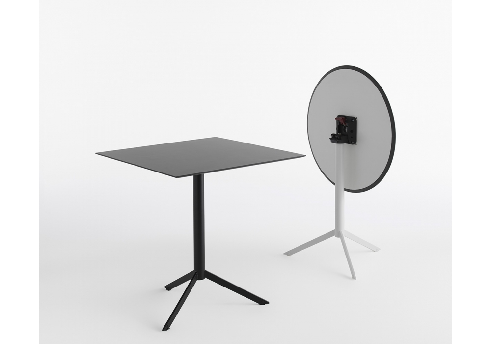 T4 conçue par Casamania & Horm est une table bistrot pliante et empilable. Le plateau peut être incliné à 90 ° pour permettre à la table d'être empilée horizontalement et peut être verrouillée au moyen d'un levier spécial en dessous. Structure en métal peint et plateau en stratifié HPL rond ou carré. Dans la version blanche, la bordure du HPL est noire. Disponible en 2 finitions.