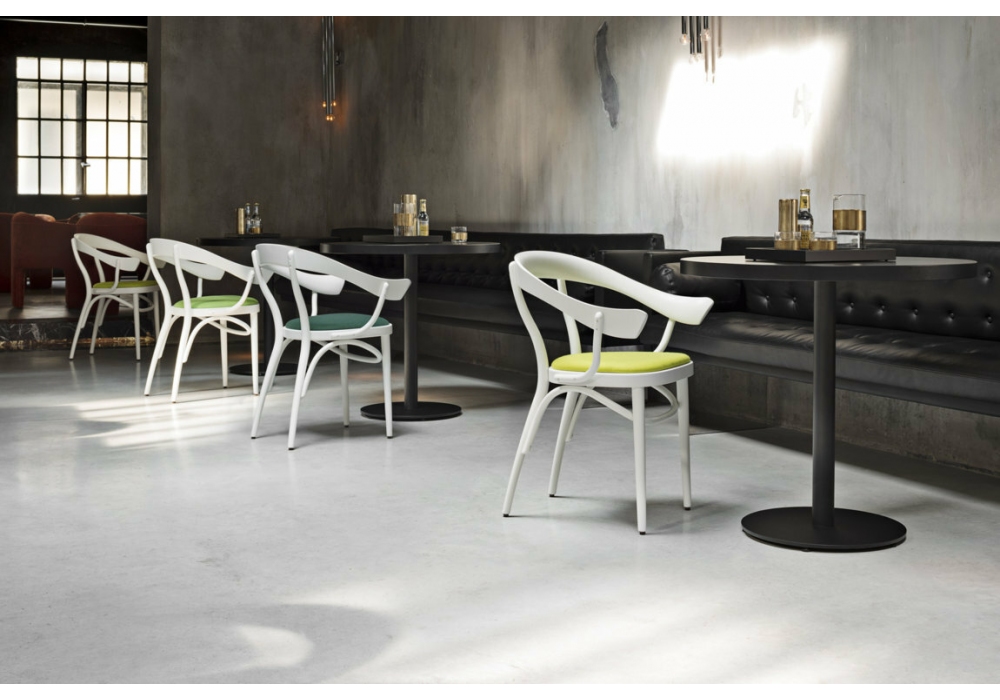 Porto conçue par Gebrüder Thonet Vienna est une table de bar avec montant, plateau et base ronds. Base en métal peint en noir mat ou avec finition bronzée. Plateau recouvert de stratifié ou de placage chêne naturel ou teinté.