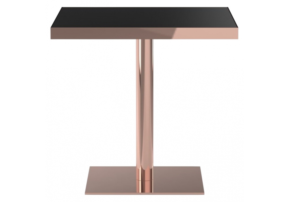 Rum conçue par Gebrüder Thonet Vienna est une table de bar disponible en deux hauteurs. Base carrée et tige en métal, finitions cuivre poli ou laiton poli. Plateau carré disponible en marbre, stratifié ou placage chêne naturel ou teinté.