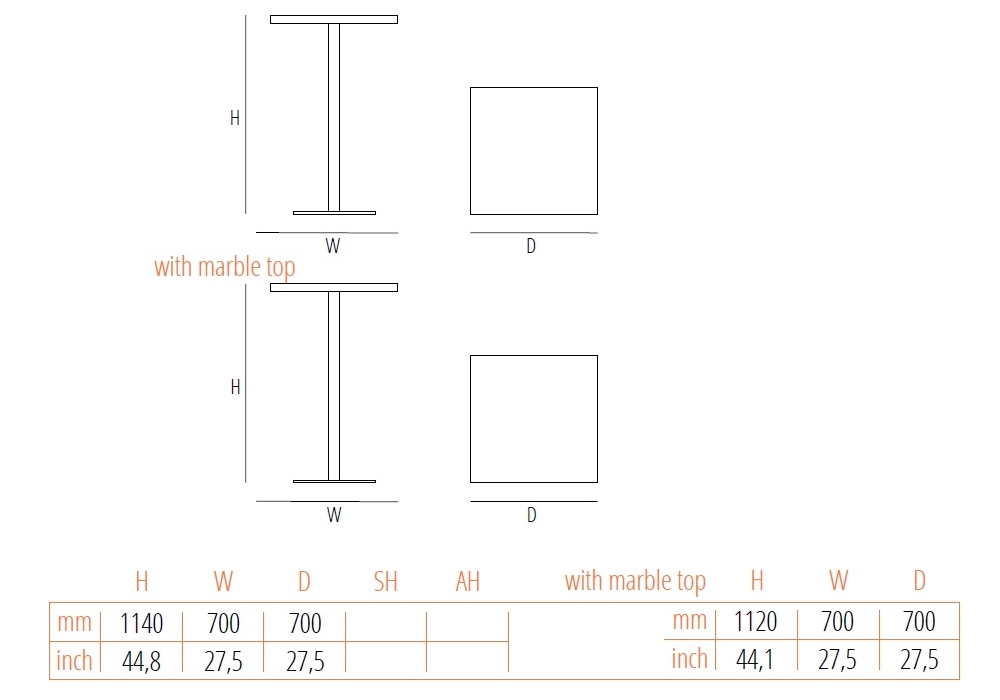 | Dimensions | • 70 x 70 x H 76 cm; • 70 x 70 x H 114 cm |