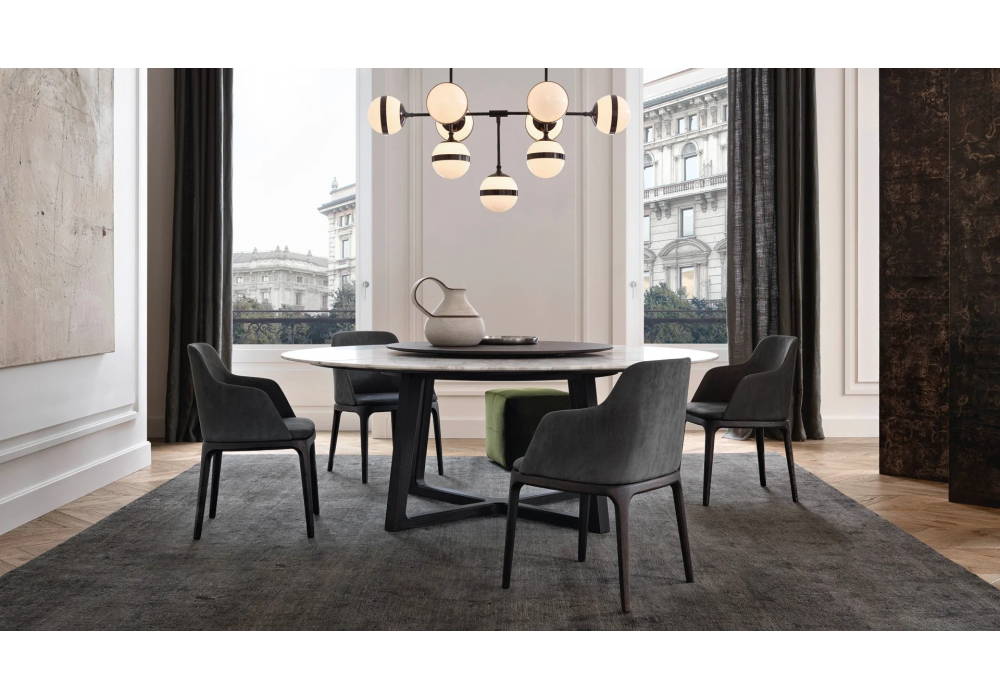 Concorde conçue par Emmanuel Gallina pour Poliform est une table réalisée avec une structure en bois massif et un plateau en marbre. Disponible en différentes finitions et dimensions. Tables rondes Ø 180 et Ø 200 pouvant être équipées de Lazy Susan.