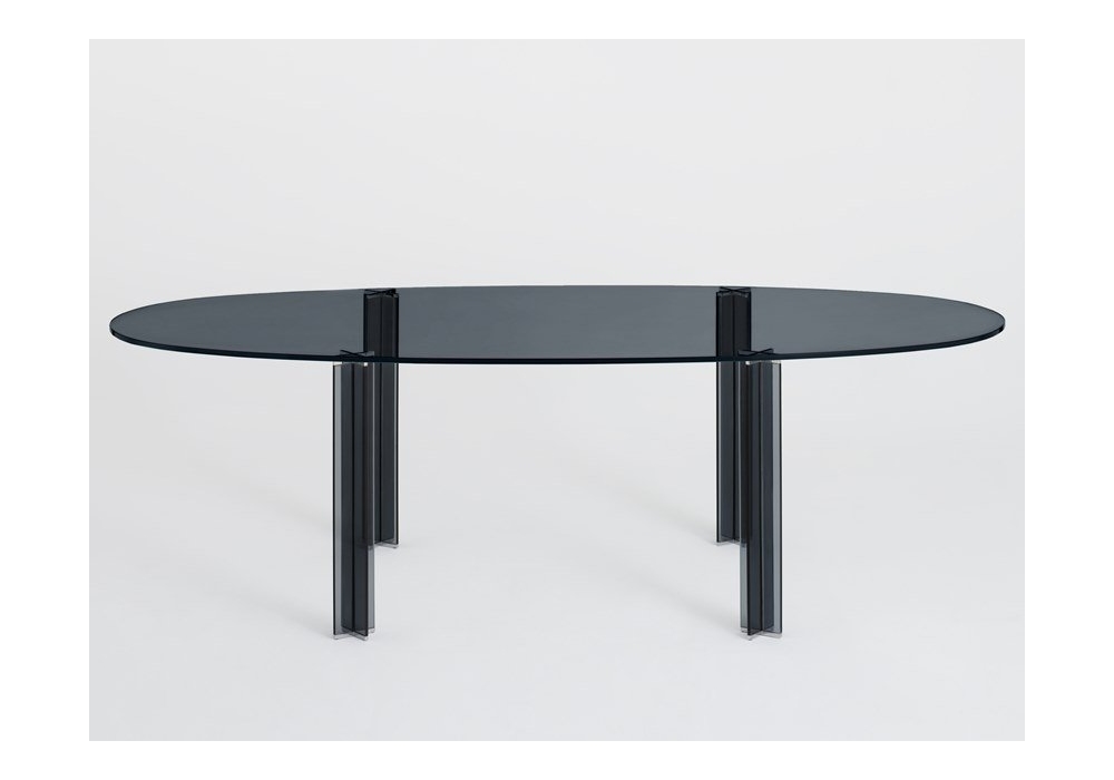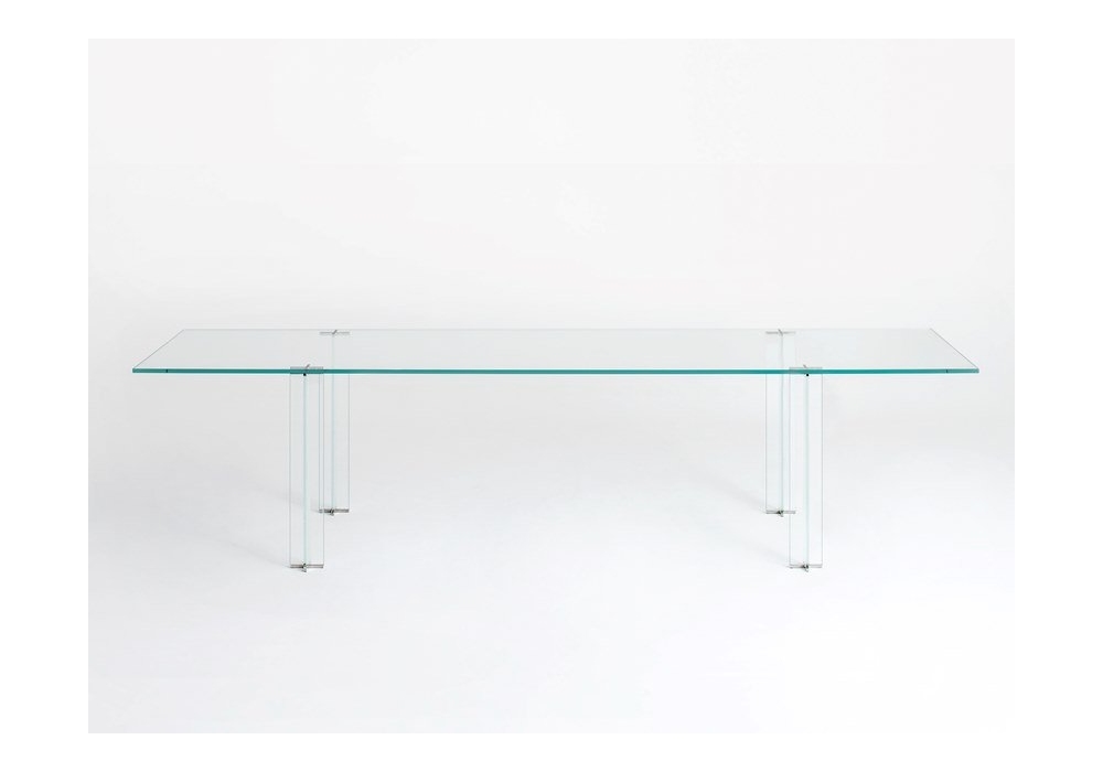 X-T conçue par Piero Lissoni pour Glas Italia est une table haute de forme carrée, ronde, ovale ou rectangulaire avec plateau en verre transparent extralight mm 15, ou en verre fumé ou bleu en pâte stratifiée 8 + 8 mm. Les pieds, en verre trempé extra-clair, fumé ou bleu de 10 mm, collés aux UV, sont amovibles et fixés au plateau au moyen de paires de plaques sophistiquées, en acier inoxydable poli miroir. par quatre pieds en acier inoxydable poli miroir, parfaitement intégrés à la forme des jambes.Disponible en différentes tailles.