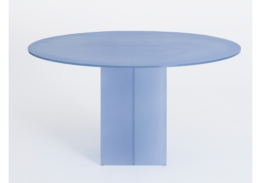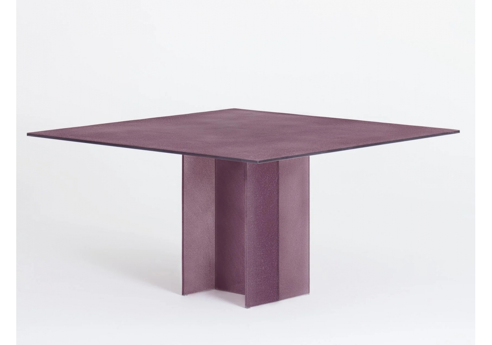 Simoon conçue par Patricia Urquiola pour Glas Italia est une table réalisée en collant des feuilles de verre extralight de 12 mm aux UV. bord poli rectifié, dont la surface est recouverte d'un grain spécial obtenu à partir de verre de Murano haché, disponible dans les couleurs améthyste, bleu clair et topaze.