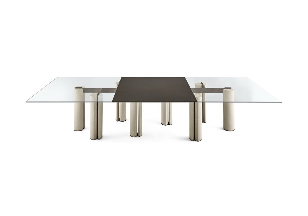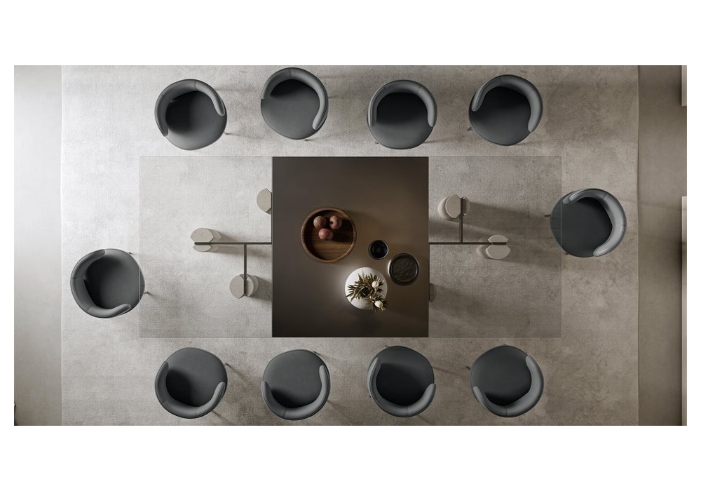 Simpòdio System conçue par Pinuccio Borgonovo pour Gallotti&Radice est une table avec plateau trempé de 12mm d’épaisseur, disponible en extralight, “grigio Italia” fumé ou verni avec finition exclusive bronze ancien et plomb. Bases en béton allégé dans le couleur ivoire ou anthracite. Parties métalliques en métal laqué couleur “fango”.
