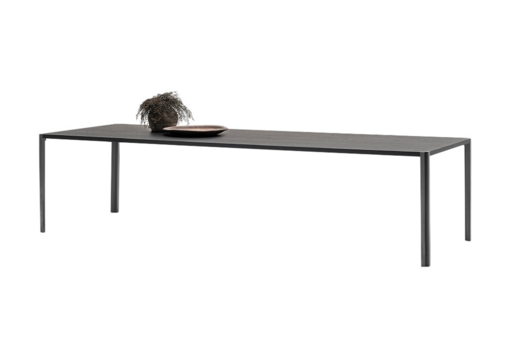 Graft conçue par David Lopez Quincoces pour Living Divani est une table avec plateau disponible en Stone Oak® ou placage chêne teinté charbon de bois ou naturel, ou en placage de bois multilaminé Striped Grey, avec peinture acrylique. Pieds en aluminium peint avec des poudres époxy de couleur gris canon de fusil ou bruni. Disponible en différentes dimensions.