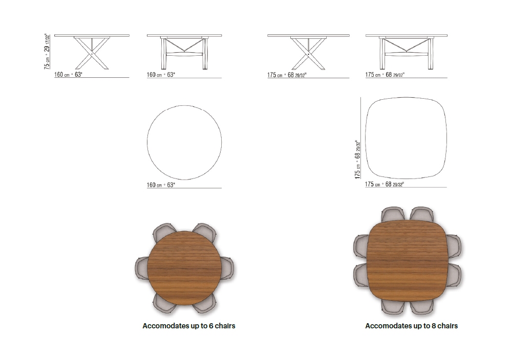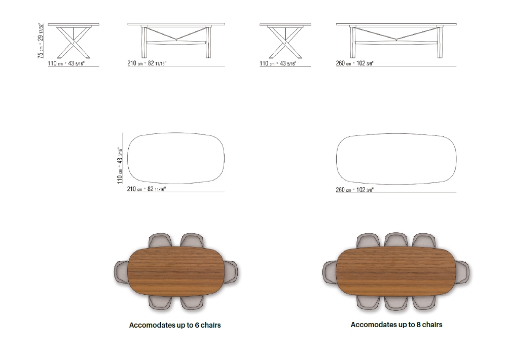 | Dimensions | • Ø 160x H 75 cm; • 210 x 110 x H 75 cm; • 260 x 110 x H 75 cm |