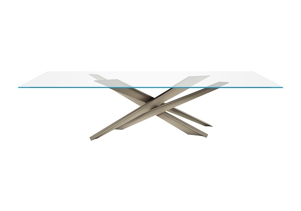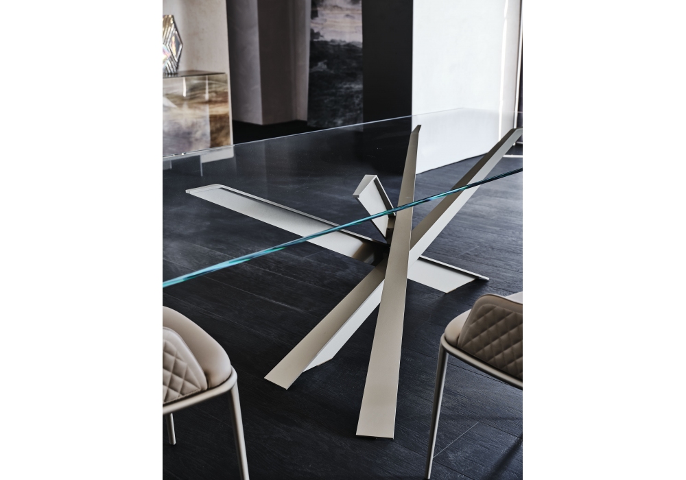 Lancer conçue par Renato Guerra pour Cattelan Italia est une table avec plateau en verre clair (15 mm), extra-clair ou extra-clair avec bords biseautés inversés. Base en acier verni.