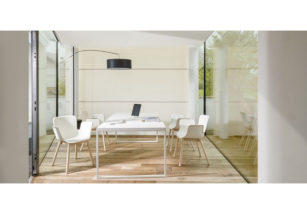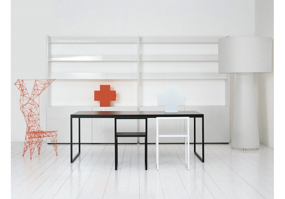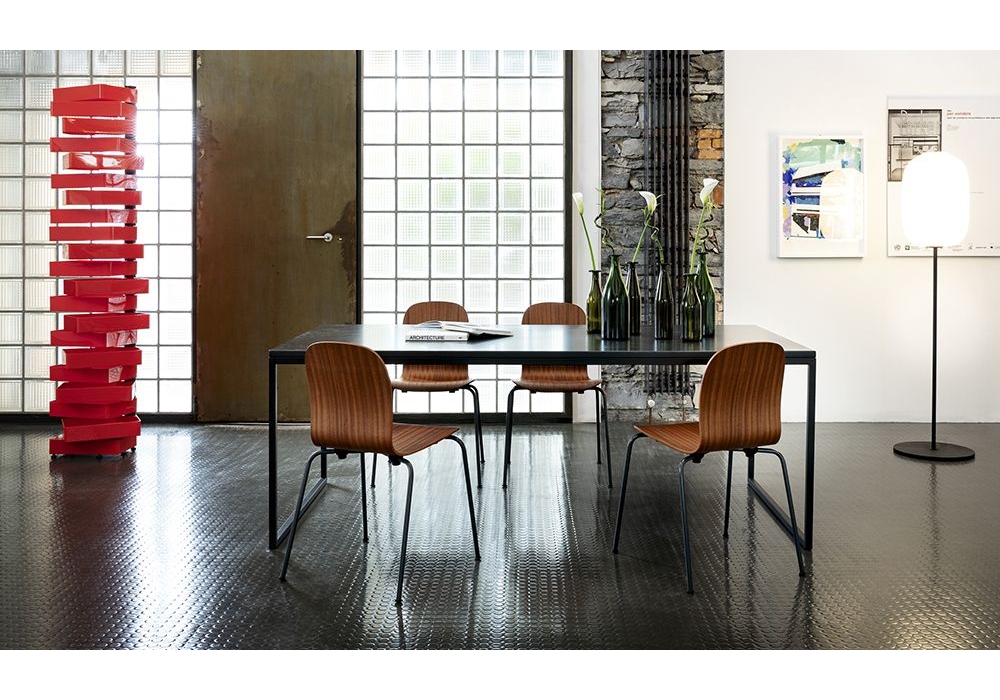Fronzoni '64 conçue par AG Fronzoni pour Cappellini est une table réalisée avec une base en tube de métal carré et un plateau en panneau de conglomérat de bois de densité moyenne. Disponible en différentes finitions et dimensions.