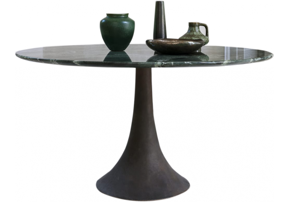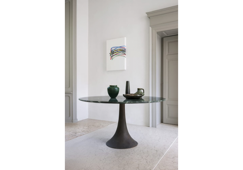 SK207 conçue par Mangiarotti pour AgapeCasa est une table ronde avec support central en bronze coulé avec moule à cire, surface traitée avec patine au nitrate d'argent à chaud. Le plateau est en marbre dans différentes finitions.