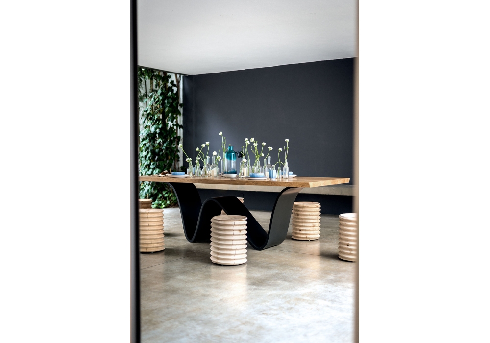 Bree e Onda conçue par Passon & Savorgnani pour Riva 1920 est une table à plateau en bois massif avec des planches collées à côtés carrés, combinée à un pied particulier avec une forme sinueuse qui rappelle les vagues de la mer.