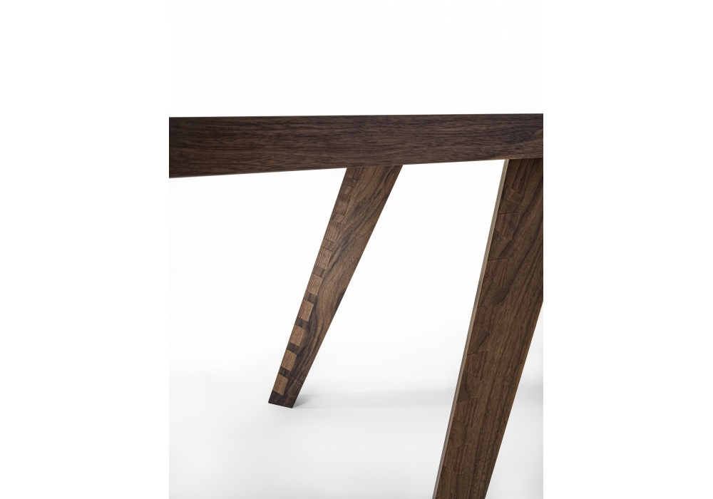 Dovetail Table conçue par Mario Bellini et Raffaele Cipolletta pour Riva 1920 est une table entièrement en bois massif, plateau avec planches collées et pied avec traitement particulier en queue d'aronde.
